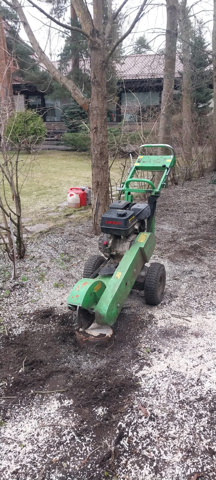 - Использование измельчителя (фрезеровщика). Это специализированная машина с вращающимся фрезерующим диском с зубьями из твердосплавной стали. Она не выкорчевывает пенек, а перемалывает его в щепу на глубину до 30-50 см ниже уровня земли. Процесс занимает от 15 минут до 2 часов в зависимости от размера ствола. После измельчителя не остается огромных ям, но при этом он удаляет основную массу корневой системы.